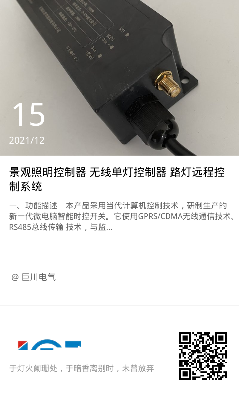 ? ?本產品采用當代計算機控制技術,研制生產的新一代微電腦智能時控開關。它使用GPRS/CDMA無線通信技術、RS485總線傳輸 技術,與監控中心進行實時通訊,方便、快捷、可靠的實現了遠程控制及數據交換,同時,改類型時控器具有,定時控制、經緯控制、光照控制、雨控控制、節假日 控制燈多個可定制模塊,以滿足不同客戶群體的需求。當使用遠程控制時,用戶只需在監控中心配套軟件上點擊鼠標,即可控制現場設備的開通和關斷,如果使用本 機自動工作,只要設置好相關參數,控制器本身即可依據不同城市所處不同地理位置并跟隨的季節變自動調整控制時段,對不同地區的照明設施進行科學、合理地開、關燈控制。無須人工調整、不僅節約了電能,而且還減輕了工作人員的勞動強度、提升了照明設施的管理水平。
