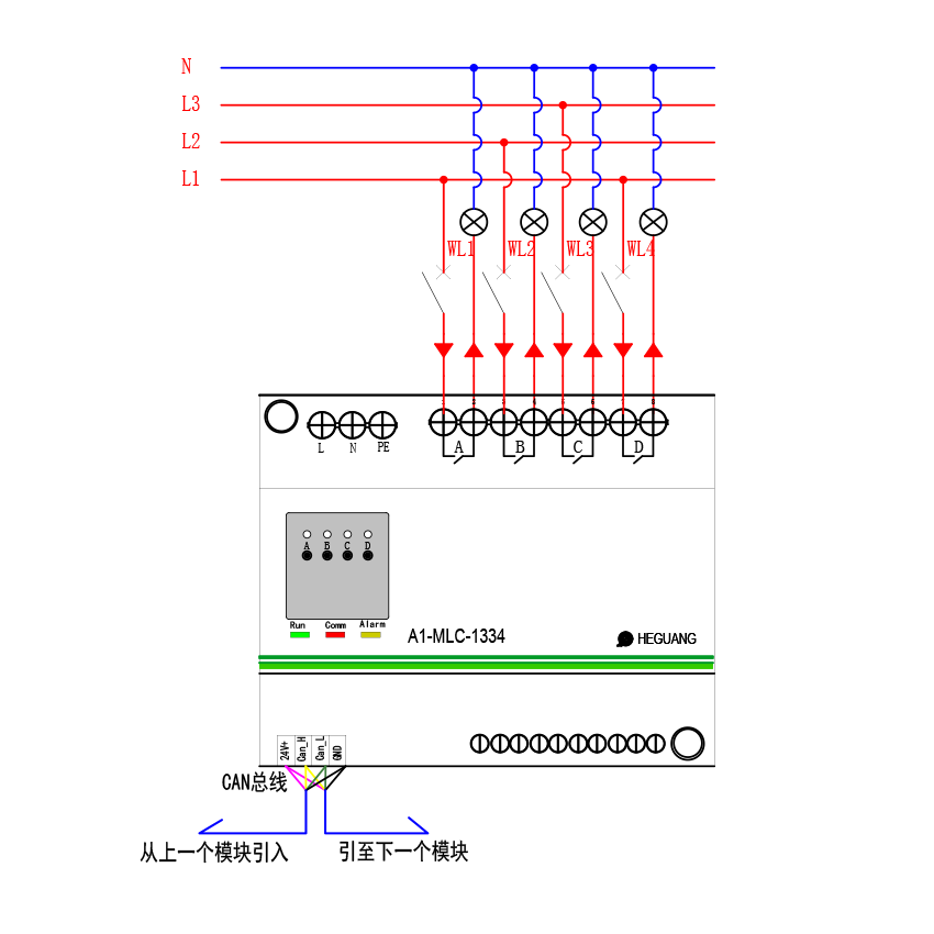 ? ? ? ?更多關(guān)于A1-MLC-1344 4路繼電器控制模塊 燈控系統(tǒng)接線圖 型號說明歡迎聯(lián)系巨川電氣。