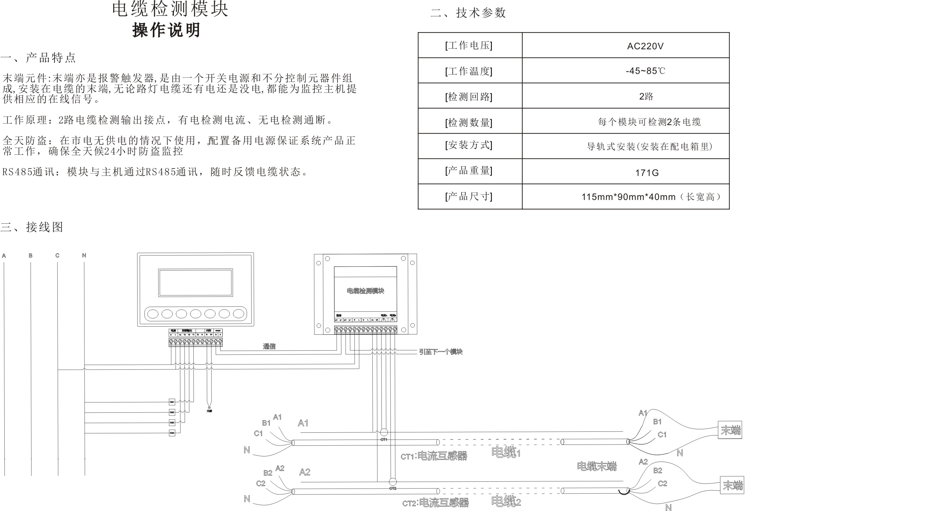電纜防盜裝置主要是用于防止電纜被盜的控制系統(tǒng)。電纜防盜監(jiān)控系統(tǒng)由接警終端(即值班人員手機(jī),并可連接到110報(bào)警中心聯(lián)動(dòng))、現(xiàn)場防盜監(jiān)控器和安裝于電纜末端的終端檢測器共三部分組成。是通過FBM406N電纜防盜報(bào)警主機(jī)與防盜末端FBD402N之間電力載波通訊進(jìn)行連接,由于電力載波信號(hào)是利用既有的電力線作為通訊媒介,所以無須布線,系統(tǒng)實(shí)施快速報(bào)警。防盜主機(jī)同時(shí)監(jiān)控回路的電流電壓信號(hào),用于輔助判斷斷纜警情的發(fā)生,防止誤報(bào)。