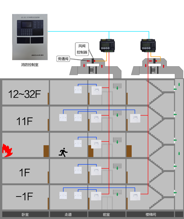 針對(duì)各類(lèi)機(jī)械加壓送風(fēng)系統(tǒng)的應(yīng)用特點(diǎn),SC560智能余壓監(jiān)控系統(tǒng),是集工業(yè)計(jì)算機(jī)技術(shù)、通訊、抗電磁干擾、數(shù)字傳感技術(shù)及消防二總線于一體的智能化系統(tǒng)。采用高靈敏度壓力信號(hào)傳感器,24小時(shí)實(shí)時(shí)自動(dòng)巡檢并采集監(jiān)控區(qū)域壓力變化等工作狀態(tài),對(duì)超壓等故障發(fā)出報(bào)警信號(hào)并記錄。當(dāng)防煙樓梯間或前室余壓值達(dá)到超壓監(jiān)控值時(shí),SC560-T02余壓探測(cè)器發(fā)出報(bào)警信號(hào),SC560-K01余壓控制器打開(kāi)加壓風(fēng)機(jī)風(fēng)管上的旁 通閥泄壓;余壓回落到正常區(qū)間值后,余壓探測(cè)器發(fā)出信號(hào),余壓控制器關(guān)閉旁通閥,通過(guò)控制旁通泄壓閥的開(kāi)啟,來(lái)保持余壓值穩(wěn)定在規(guī)范要求的區(qū)間值內(nèi),系統(tǒng)具有實(shí)時(shí)性、數(shù)字化、智能化,自動(dòng)化連續(xù)監(jiān)控的特點(diǎn)。