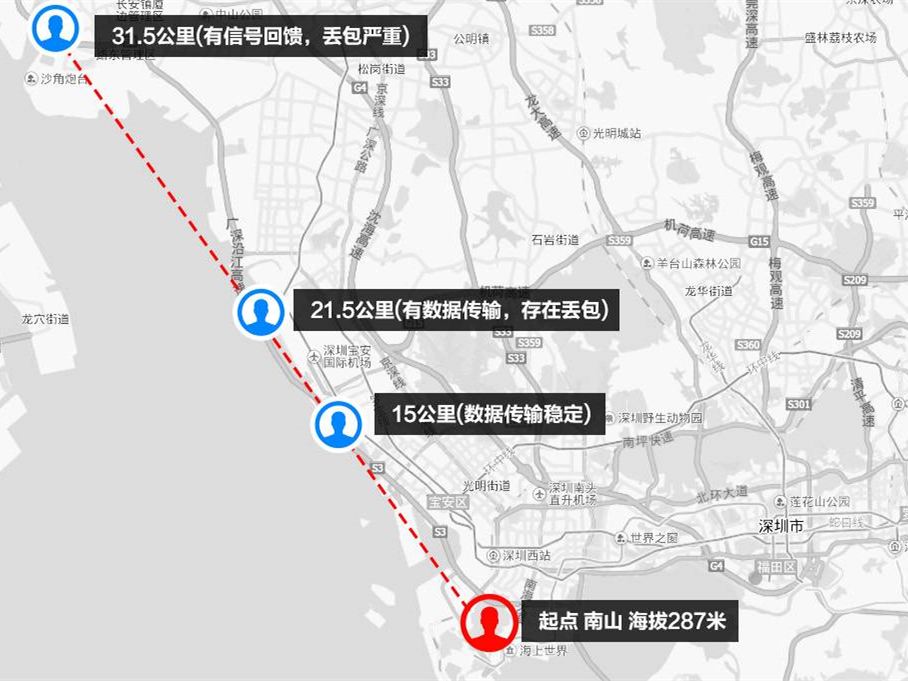 本次LoRa空空平行可視距離測(cè)試區(qū)域的概貌。首先將發(fā)射模塊放置在起點(diǎn)位置,在平行可視距離范圍內(nèi),測(cè)試人員坐車從前海向?qū)毎参鬣l(xiāng)出發(fā),分別在坪洲新村附近(8.5公里)、福永碼頭附近(15.1公里)、廣深沿江高速S3(21.5公里)、東寶河大橋(31.5公里)等進(jìn)行通訊測(cè)試。測(cè)試起點(diǎn)位于深圳南山的觀景臺(tái)上,其他測(cè)試點(diǎn)和起點(diǎn)之間很空曠,有少量建筑物。