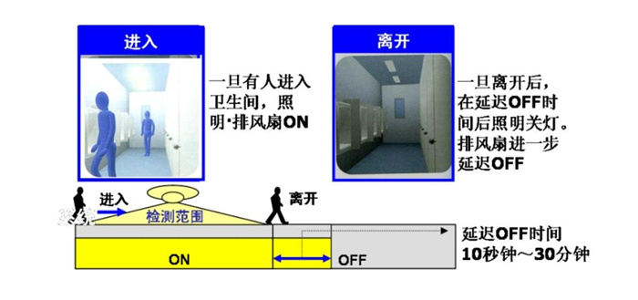 該傳感器作為輸入模塊,可以檢測室內(nèi)人員或物體的運動情況以及當前實時照度,并依照預(yù)設(shè)的邏輯發(fā)送控制命令至照明配電箱(柜)內(nèi)的驅(qū)動器從而實現(xiàn)照明的自動控制與調(diào)節(jié)。