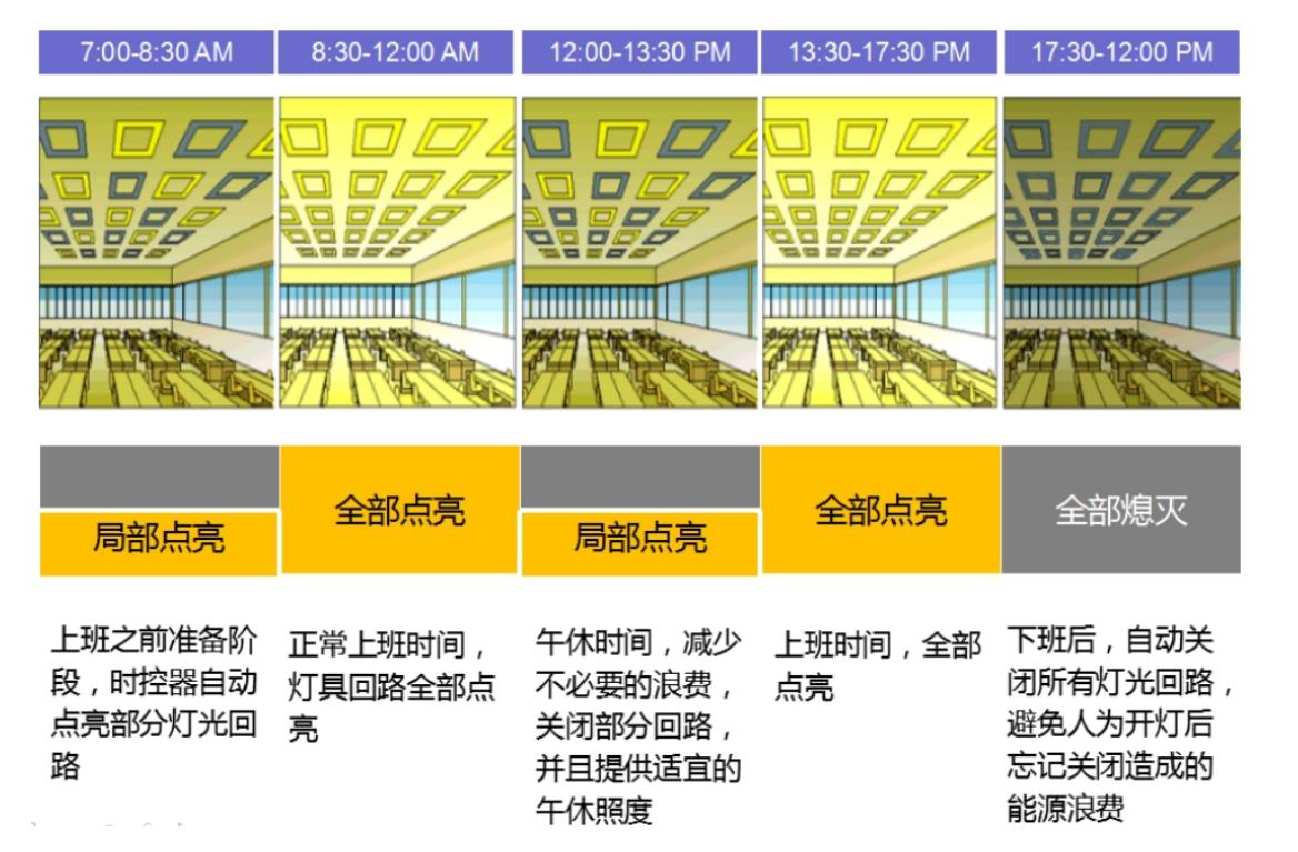 (1)時鐘控制顧名思義是時間上控制,通過時鐘管理器等電器元件對各區域內的照明燈具的時間進行控制。