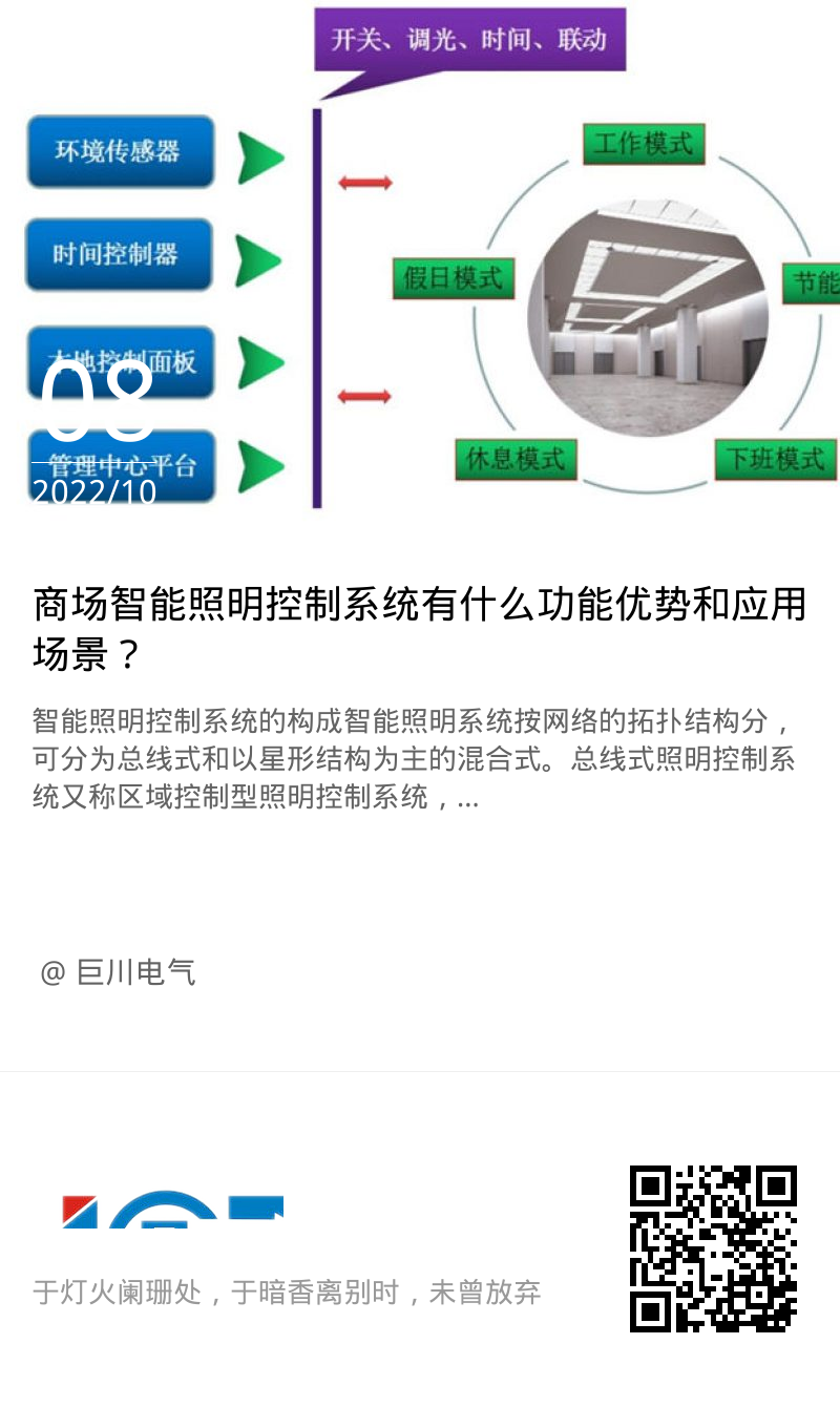 ? 智能照明控制系統具備的集中智能化管理模式,為人們的辦公和生活環境創造了更為靈活多樣、方便快捷的照明環境,系統在具體的工程中投入使用后,使整個建筑物的智能化管理水平大幅提升,更為重要的是智能照明管理系統根據實際需要調整和控制燈光的模式大大節約了電能消耗,使整個照明系統更加符合節能環保的要求。因此智能照明控制系統在未來將會有更加廣闊的應用前景。