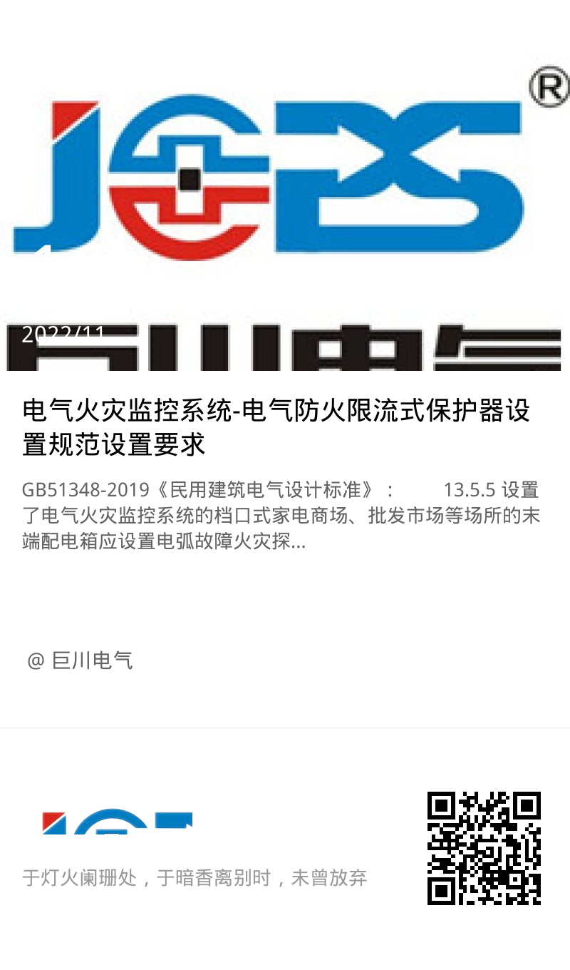 13.5.5 設置了電氣火災監控系統的檔口式家電商場、批發市場等場所的末端配電箱應設置電弧故障火災探測器或限流式電氣防火保護器。儲備倉庫、電動車充電等場所的末端回路應設置限流式電氣防火保護器。