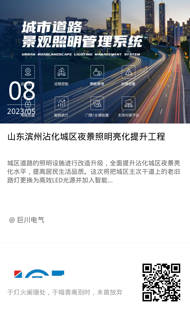 城區道路的照明設施進行改造升級,全面提升沾化城區夜景亮化水平,提高居民生活品質。這次將把城區主次干道上的老舊路燈更換為高效LED光源并加入智能照明控制系統,整體光照度提升近5倍,提升城市路燈亮化水平,改善城市照明質量,同時也提升了智慧城市的文明品質。