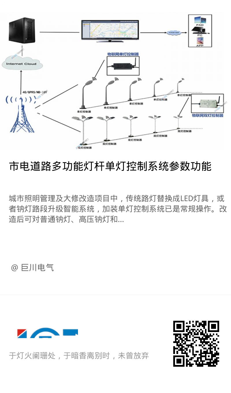 - 本工程道路照明采用單燈控制系統。在每桿路燈內設置調光單燈控制器,通過GF-LCS6008集中控制器/路燈單燈控制器管理終端接入路燈監控中心,監控中心后臺系統能直接監測單燈運行情況,可設置單燈開關、調光控制、監測報警等功能。路燈監控中心不在本工程設計范圍內,由建設單位結合工程實際情況進行選址。