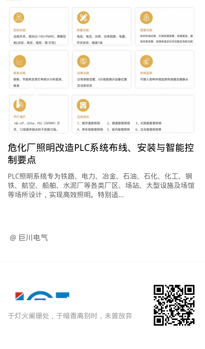 PLC照明系統專為鐵路、電力、冶金、石油、石化、化工、鋼鐵、航空、船舶、水泥廠等各類廠區、場站、大型設施及場館等場所設計,實現高效照明。特別適用于爆炸性氣體環境的1區、2區,涵蓋ⅡA、ⅡB、ⅡC類爆炸性氣體環境,以及可燃性粉塵環境的21區、22區。同時,滿足T1-T6(T5)組溫度組別的要求。對于節能改造項目及檢修更換困難的場所,以及防腐防護要求較高、潮濕、環境惡劣的場所,本產品同樣展現出卓越的適用性。