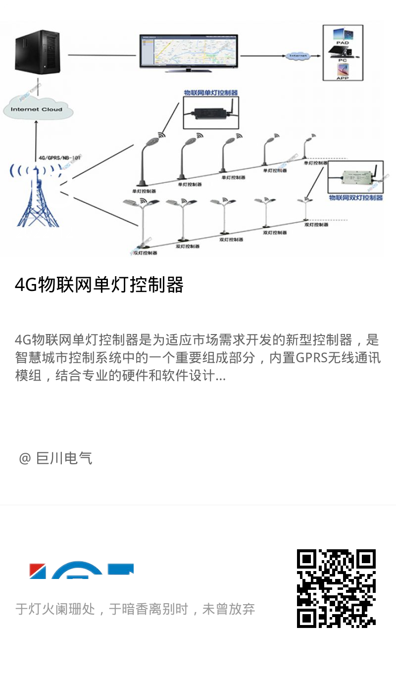 4G物聯網單燈控制器是為適應市場需求開發的新型控制器,是智慧城市控制系統中的一個重要組成部分,內置GPRS無線通訊模組,結合專業的硬件和軟件設計,無需集中控制器,每盞單燈控制器內置物聯網卡,單燈控制器可單獨接收和輸出數據至云平臺或固定IP地址,與客戶端遠程交替數據,實效性和穩定性更高。該產品具有功能強大,體積小,易實施,免布線,工作可靠,易于維護等優點。是專門為智慧城市照明而研發出來的高性能路燈節能產品。
